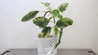 初心者が、斑入りのフランスゴムを曲げてみました。フィカス・ルビギノーサは木立ちしても柔らかいため、簡単でおすすめ。植物の頂芽優勢の特性を生かし、脇芽から新たな幹を出すことに成功しました。ビニールテープを使った簡単な曲げ方法も紹介しています。