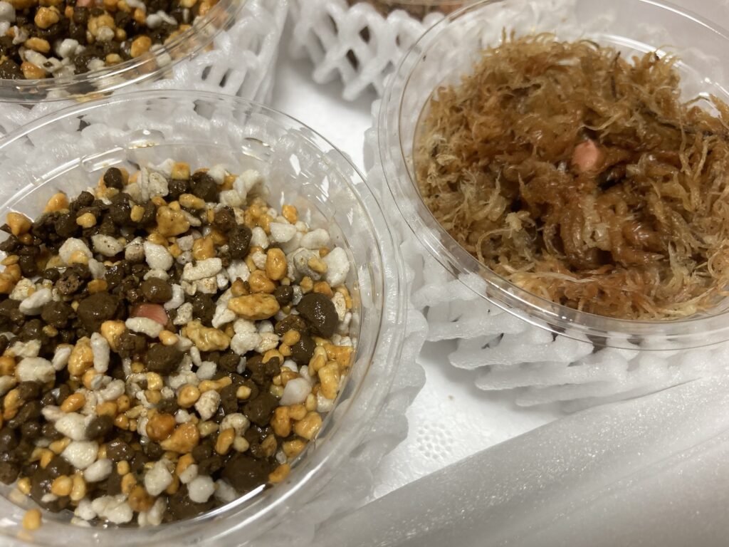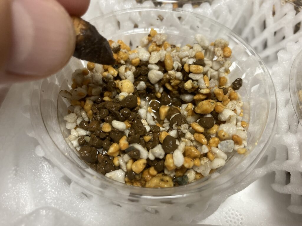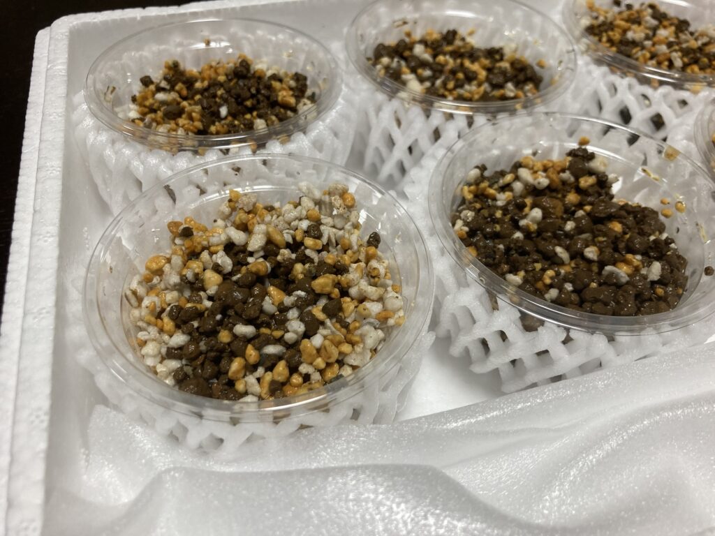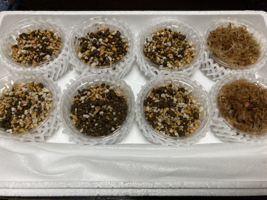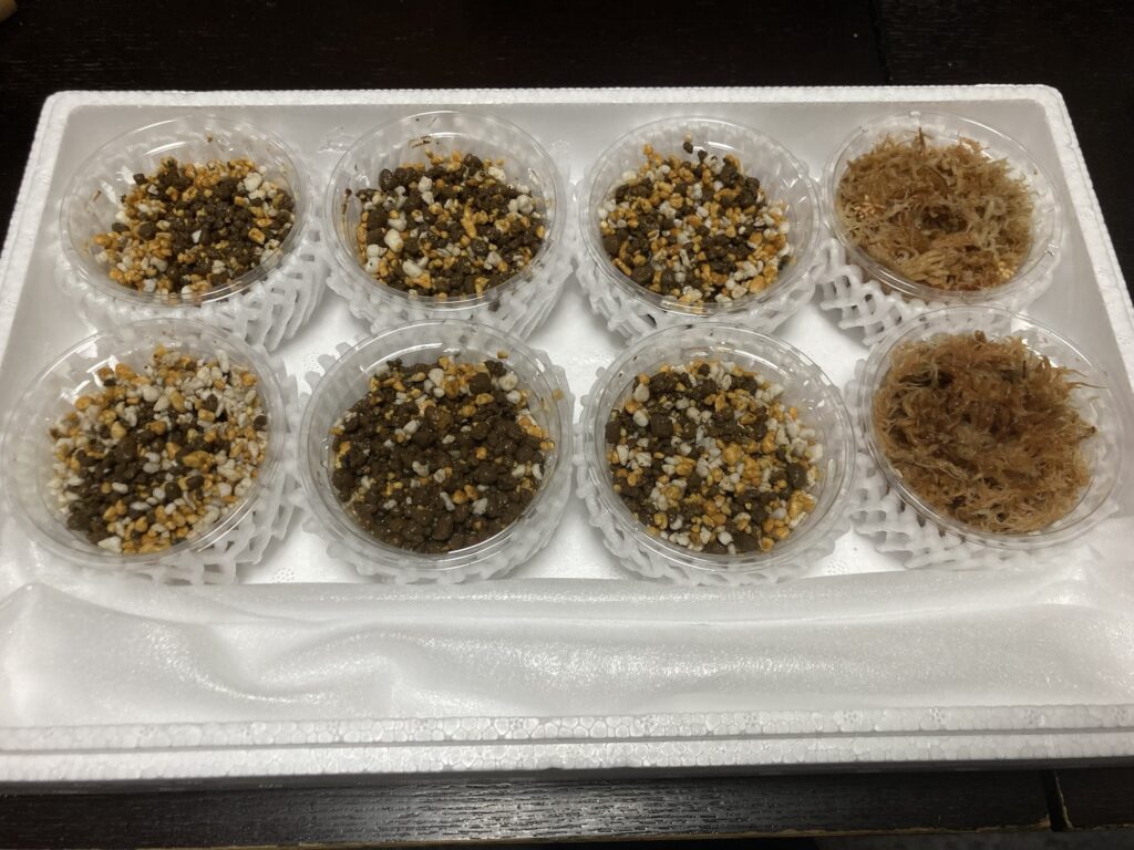 用土については本当に人それぞれで、特にこれじゃないとダメというのはなさそうです。今回は、苗になった後に、そのまま土増しができるよう、我が家で愛用している『プロトリーフの室内向け観葉・多肉の土』を6つ、保水力の高い『水苔』を2つで挑戦しました。