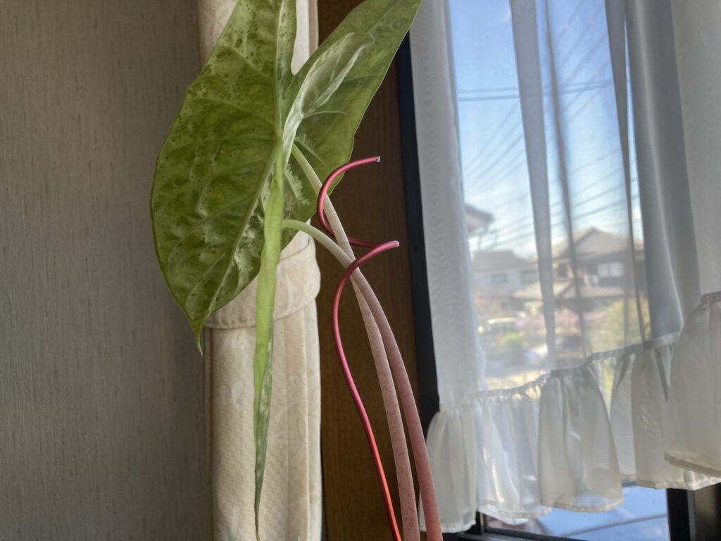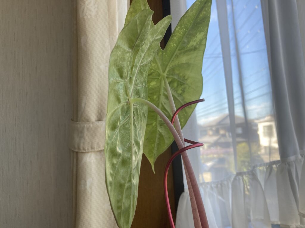 しかし、太陽光に向かって葉っぱが傾いてきたため、暴れないように支柱を立てました。葉柄が長く、場所をとりそうなので早めの対処です。