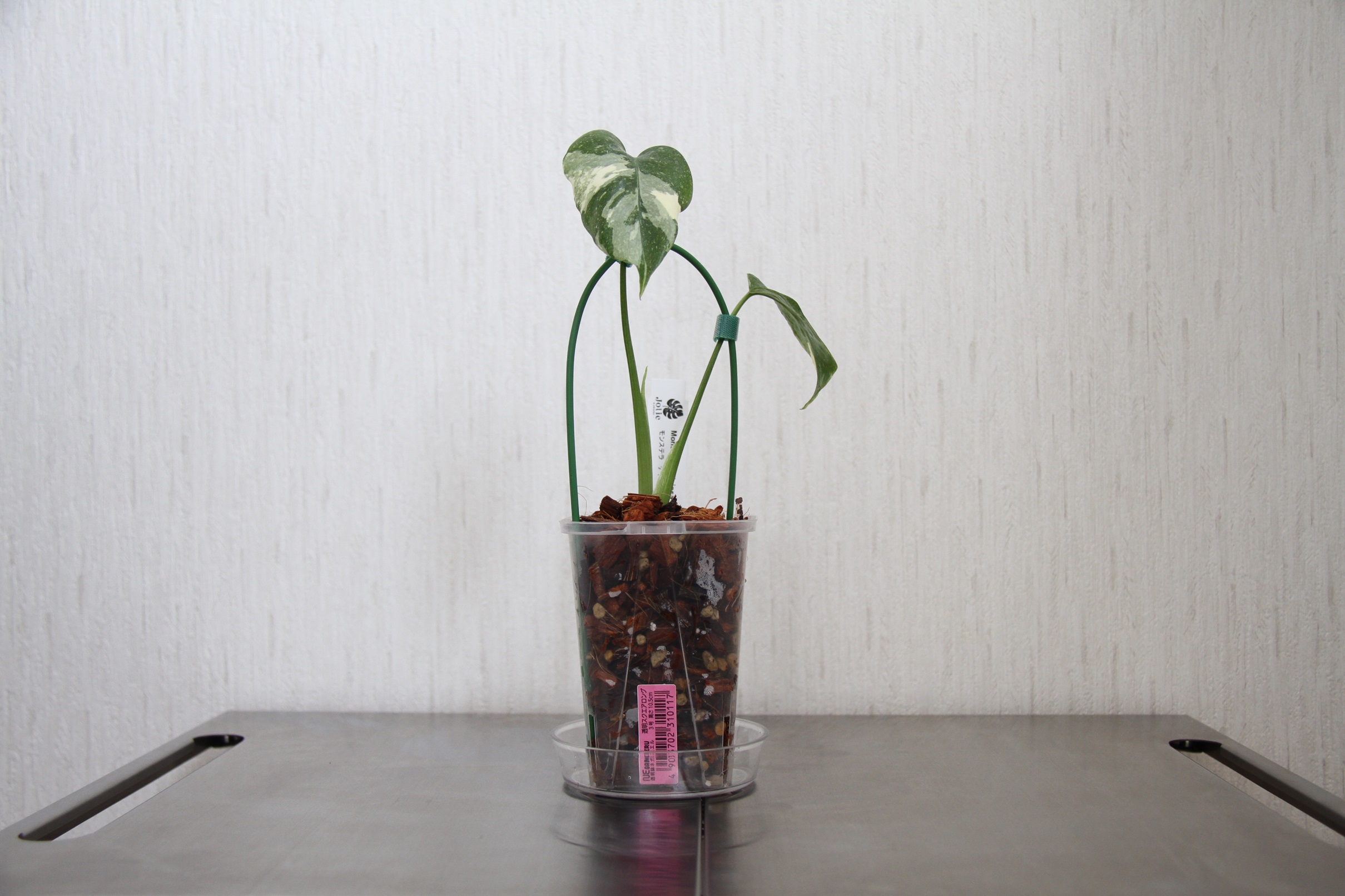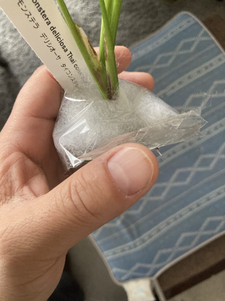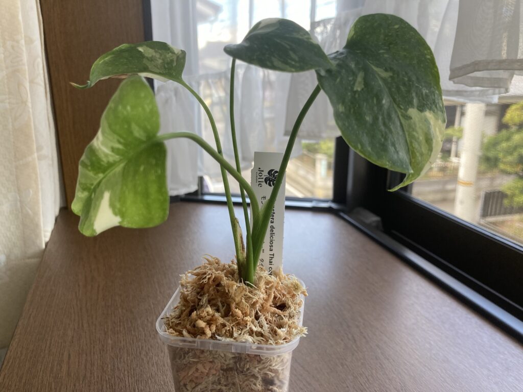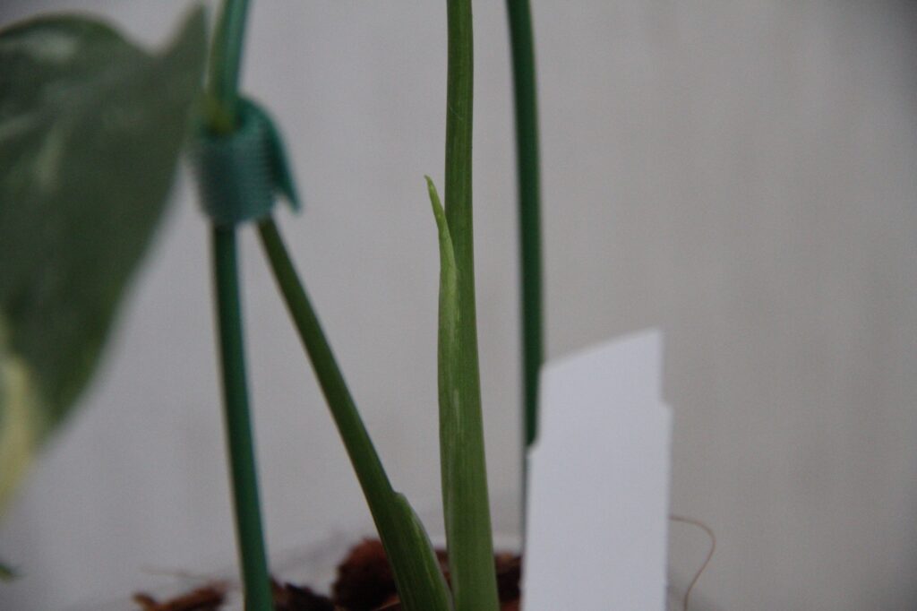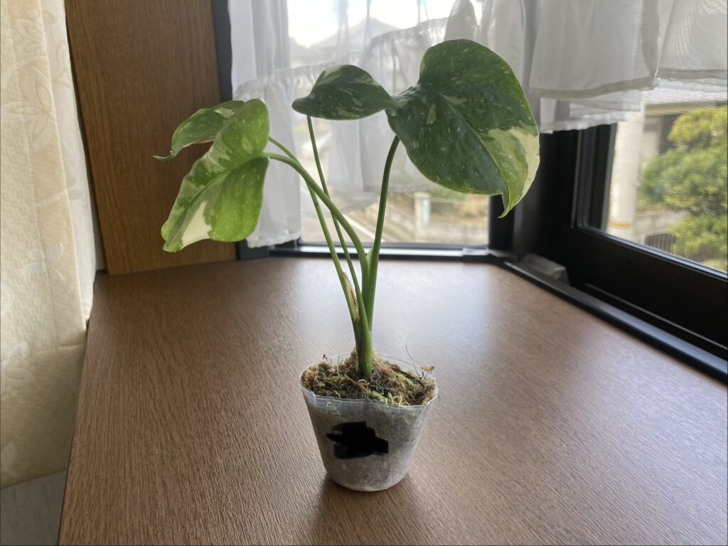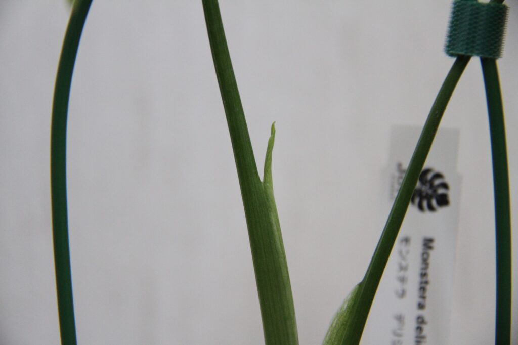 まだ小さな苗なので、モンステラの特徴的な葉っぱの切れ込みはありませんが、育てておよそ2カ月、やっとこさ新芽の動きが確認できました。