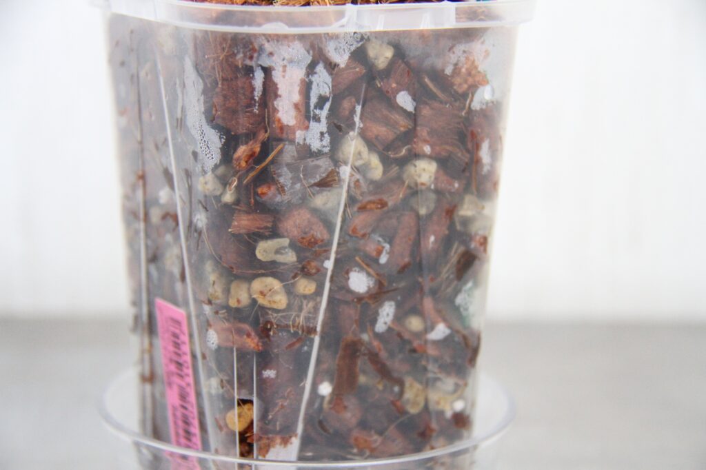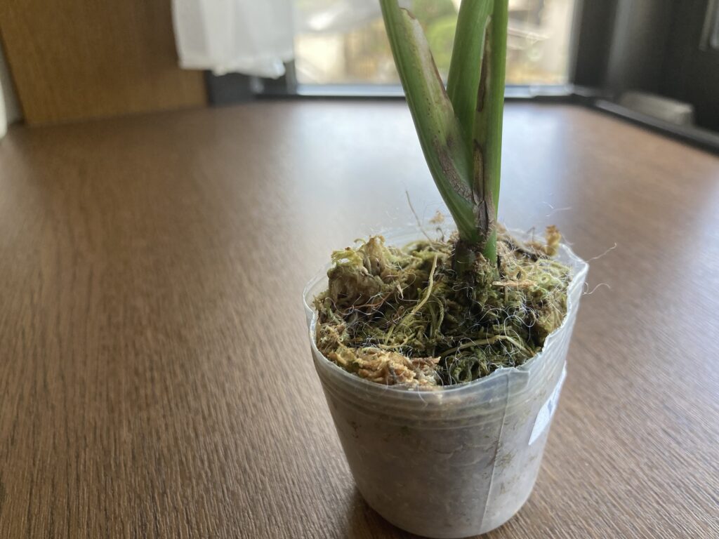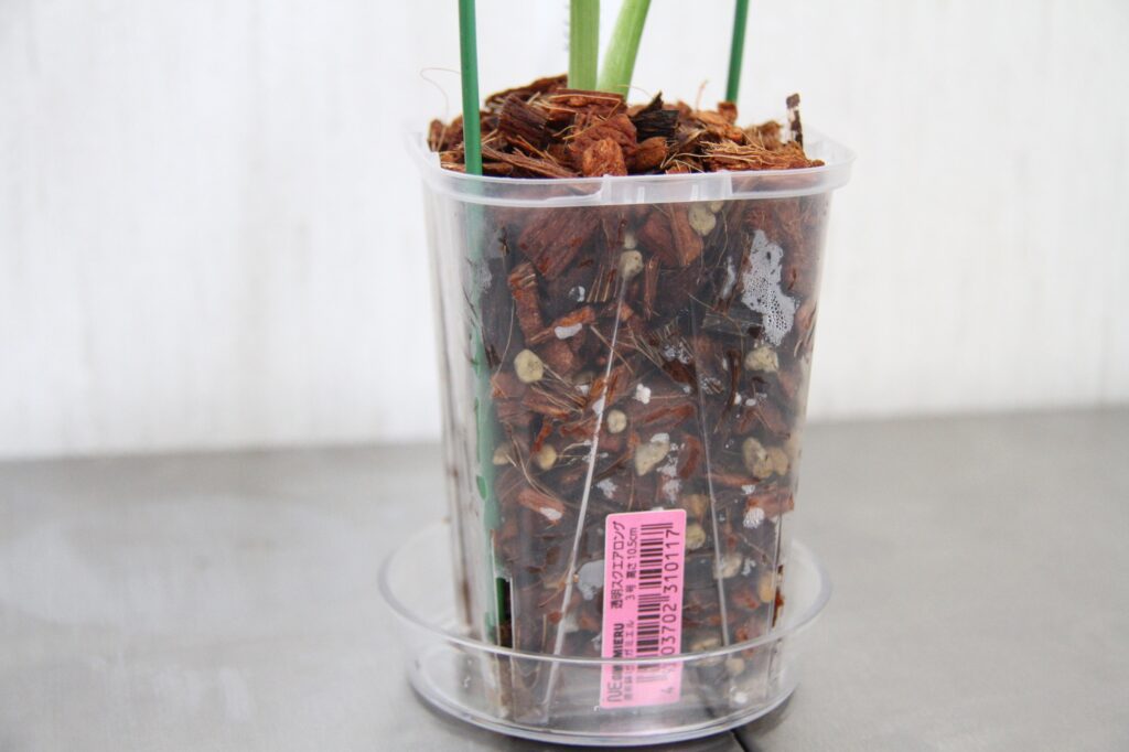 およそ2カ月、鉢の側面や底から根っこが確認できるようになり、調子も上がってきました。気温も多少上がってきたため、水苔から育てやすい用土に植え替えを行いました。