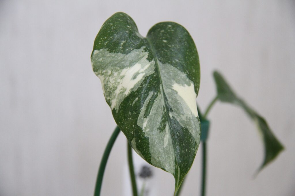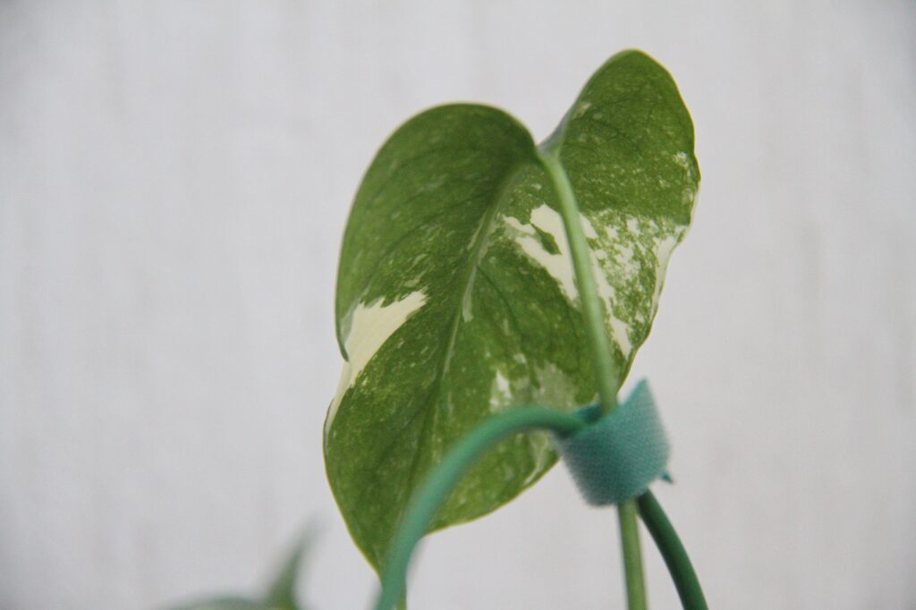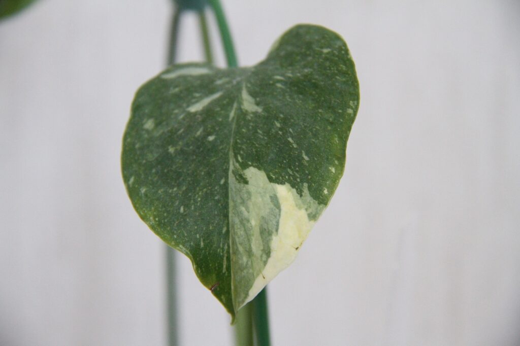 葉っぱは2枚に。左の葉っぱは白い斑なんですが、右の葉っぱはクリーム色の斑なんです。