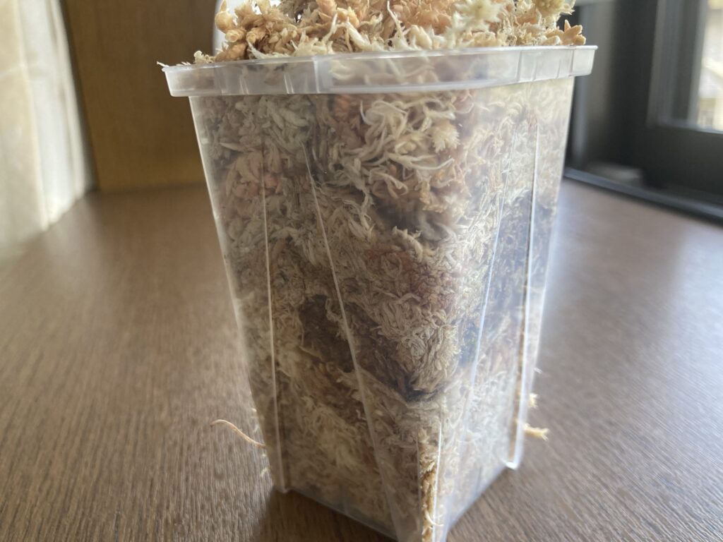 リビング管理の我が家は、暖房を切ると15度まで気温が落ち込みます。水苔を解くと根っこもちぎれてしまうため、水苔はほぐさず、土増しならぬ水苔増しで対応しました。根の動きを確認したかったので、ネガミエル2.5号に植え替え。