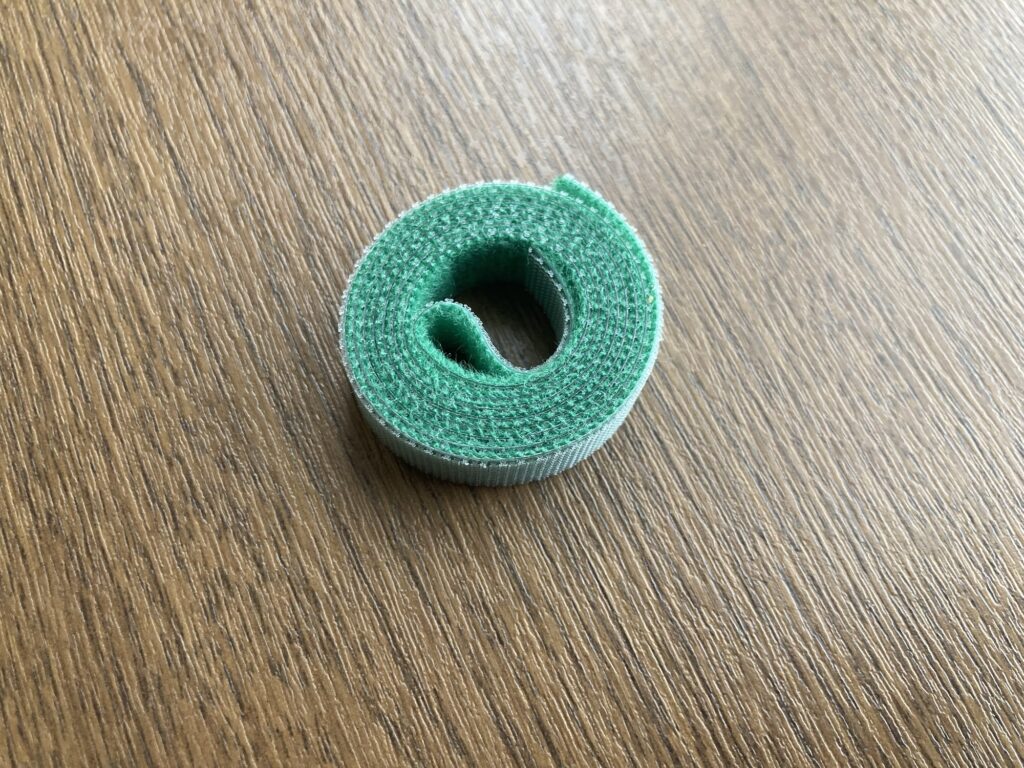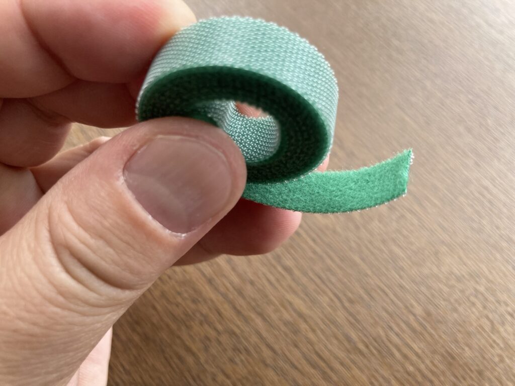 植物と固定には、植物用のガーデンテープを使います。マジックテープになっているので、好きな長さでカットし、植物と一緒に巻き付けて固定することができます。