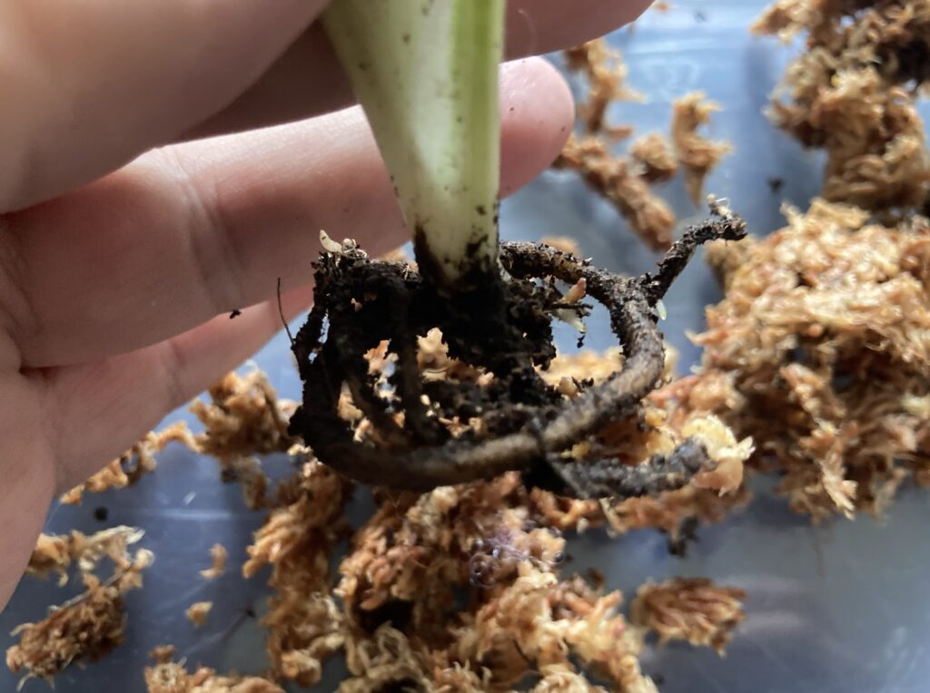 確認して分かったのは、水苔でずっと育てられていたわけではないということ。おそらく、最近土から取り出し、水苔に植え替えていたと思われます。なぜ分かったかというと、水苔に根っこが絡みつくことなく、簡単に水苔から取り出せたからです。