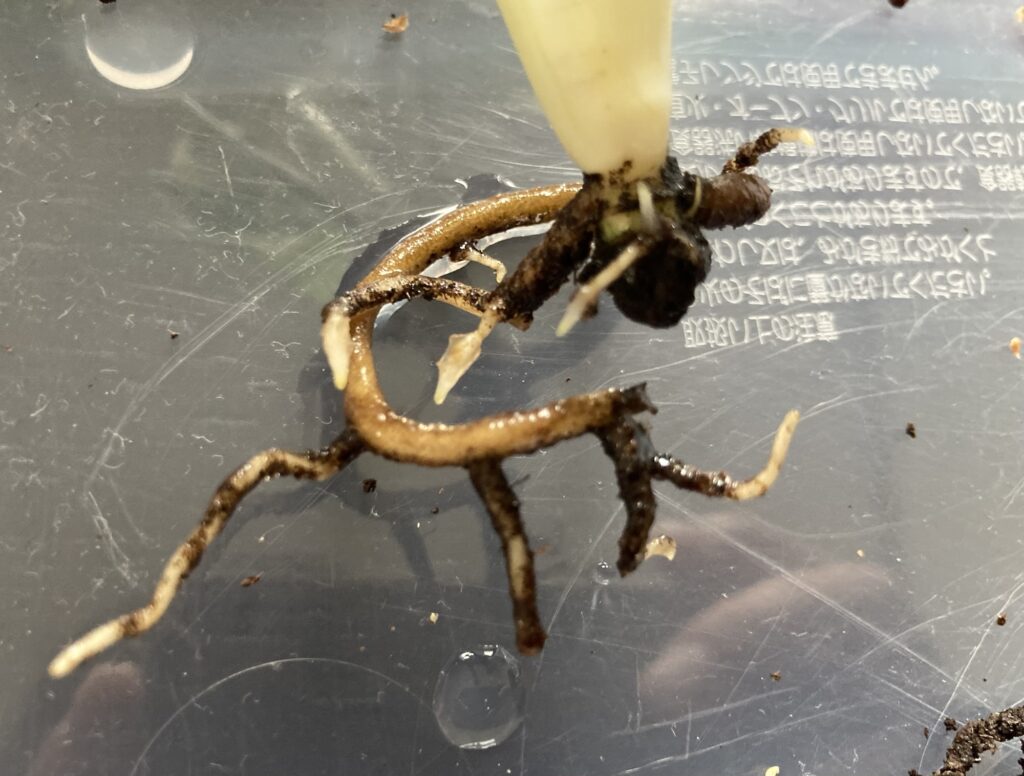 水洗いして、調子の悪そうな根っこをカットしたのがこちら。白い根っこもちらほらあり、しっかり養生すれば問題ないはず。