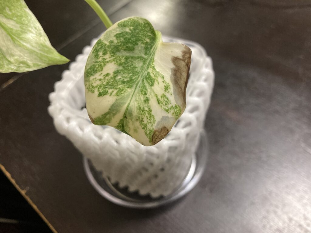 一番古い葉っぱ(左下の写真)は、さらにクルクルに丸まり、茶色く変色している辺りが少し溶けている感じ。二番目に古い葉っぱ(右下の写真)は、斑の部分が茶色く変色していました。